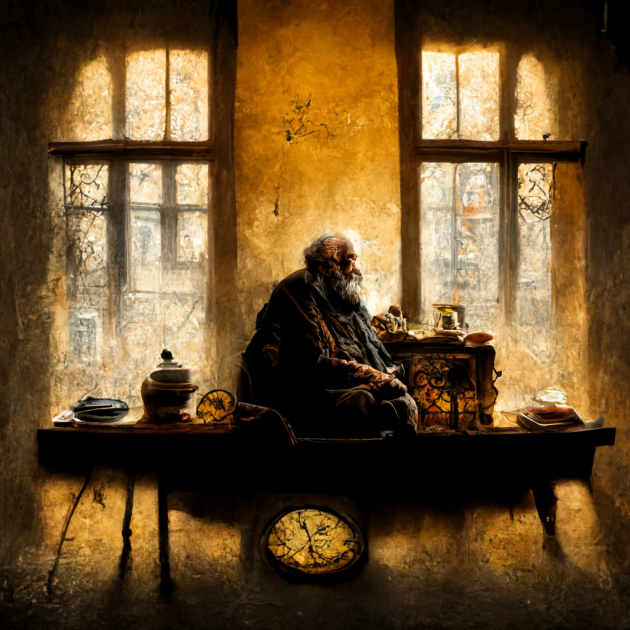 In einer Werkstatt, in der zahllose Uhren tickten und ein tosender Wind unablässig Regen an das Fenster peitschte, dort inmitten all dem, saß ein Mann. Ein sehr alter Mann, der sich mit seinem grauen Dreitagebart und einer Lupenbrille auf dem Kopf einer goldenen Taschenuhr widmete. Die Uhren tickten in einem monotonen Rhythmus, der ihm offensichtlich sehr gefiel. Immer wieder sah er auf und lächelte beim Anblick seiner vielen verschiedenen, die Zeit messenden, Schätze. Er summte gern bei der Arbeit und unterbrach dieses nur, um einen Schluck Tee aus einem alten Porzellankrug zu nehmen. Doch plötzlich spürte er einen kalten Luftzug und hörte, wie der Wind die nassen Regentropfen auf den hölzernen Fußboden seiner Werkstatt trieb.
